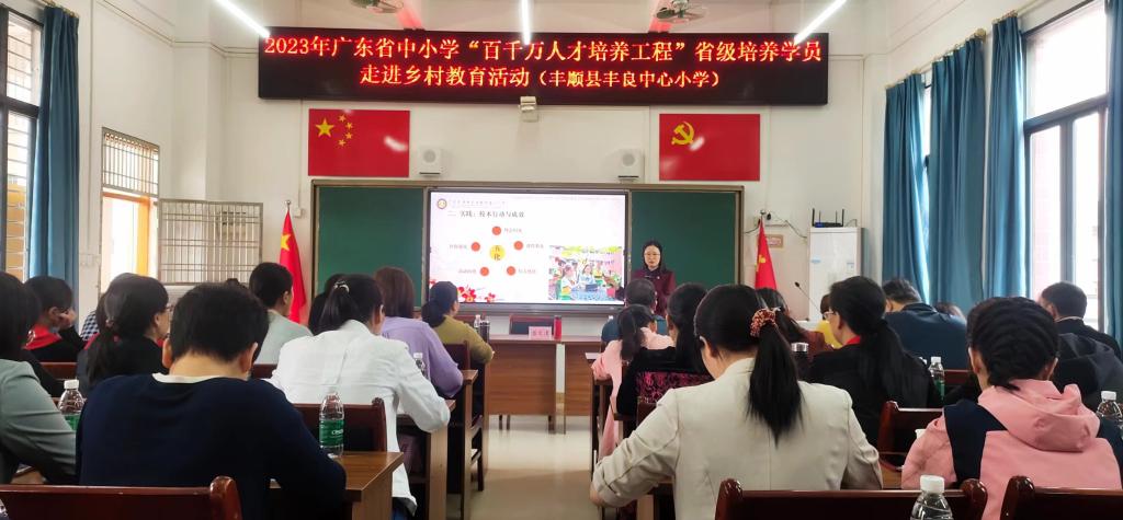 4月24日上午,肖晓玛一行到丰顺县参加中小学“百千万人才培养工程”省级培养学员走进乡村教育活动的启动仪式。34名省级名教师、名班主任、名董事长分赴丰顺县七所中小学进行为期两天的送教活动,采用线上线下两种方式授课,辐射教师约2800人。