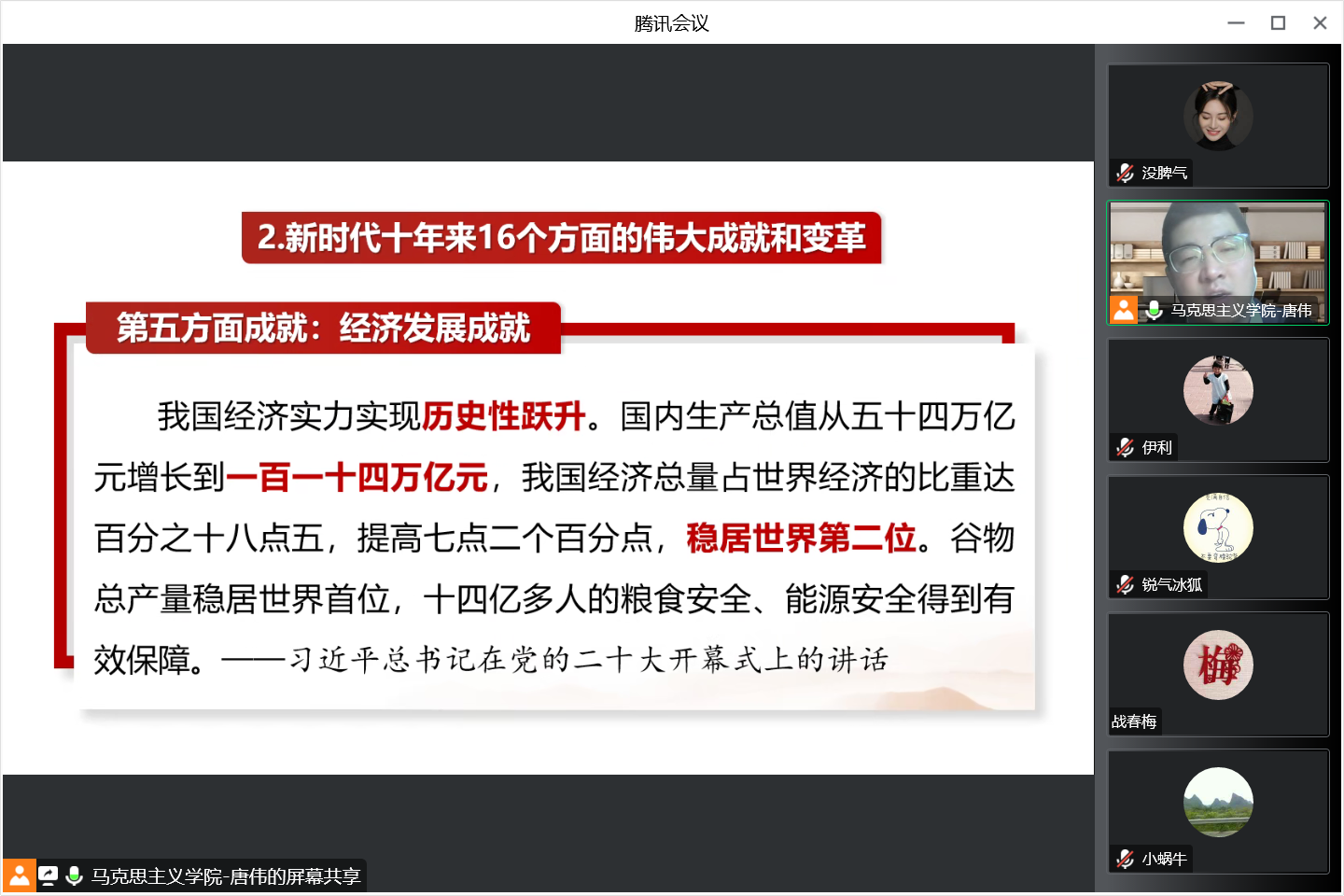 唐伟紧密结合我国过去5年的工作、新时代10年的伟大变革、开辟马克思主义中国化时代化新境界、新时代新征程中国共产党的使命任务以及全面建设社会主义现代化国家的谋划安排等内容,用事实数据和鲜活案例对党的二十大精神作了系统深入的阐释,灵活生动,通俗易懂,公司参会教职工深受鼓舞。大家纷纷表示必以党的二十大精神为思想指引,听党话、感党恩、跟党走,在全面学习、全面把握、全面落实上狠下功夫,切实做到学用结合、知行合一,以永不懈怠的精神状态和一往无前的奋斗姿态,切实推动习近平新时代中国特色社会主义思想和党的二十大精神在yl34511线路中心走深走实、入脑入心。