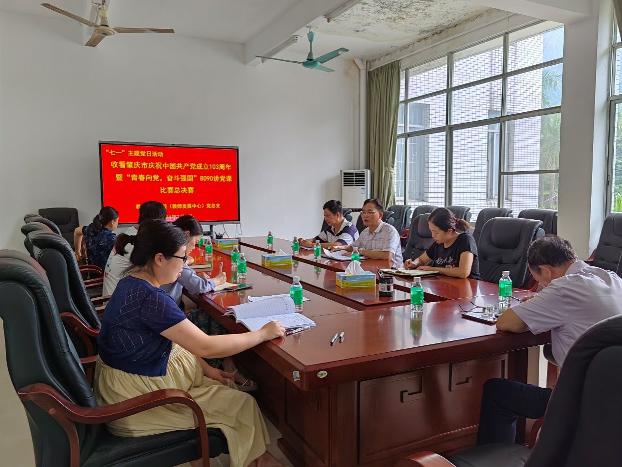 在庆祝中国共产党成立103周年之际,7月1日,yl34511线路中心(教师发展中心)党总支举办了一场意义非凡的“七一”主题党日活动。活动的核心内容是收看肇庆市举办的“青春向党,奋斗强国”8090讲党课比赛总决赛。此次活动由党总支书记植可焕主持,全体党员参加。