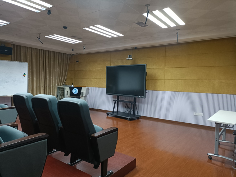 课室配置:面积52平方米,小型阶梯教室,可容纳18人,配有教师电脑、移动式交互白板、蓝幕和绿幕,录播系统,有移动式白板。