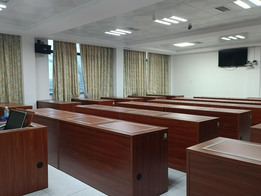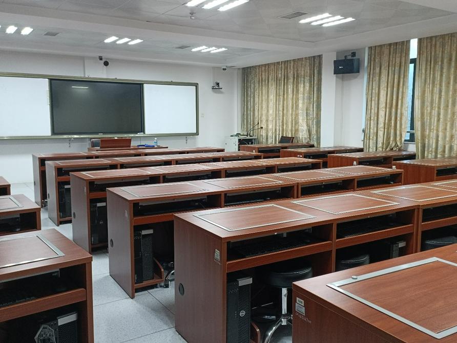 课室配置:面积78平方米,可容纳45人,配有教师电脑1台、员工电脑45台、电子交互白板,4机位录播系统,有固定式白板。