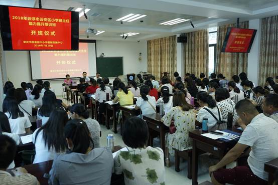 2018年7月10日下午,2018年云浮市云安区小学班主任能力提升培训班开班仪式在yl34511线路中心省级中小学教师发展中心106室隆重举行。yl34511线路中心省级中小学教师发展中心副主任、yl34511线路中心经理肖起清教授,yl34511线路中心教师专业能力发展中心、教师教学发展中心副主任肖晓玛博士,云安区教育局梁坤荣科长及云安区100名小学班主任,共同出席了开班仪式。