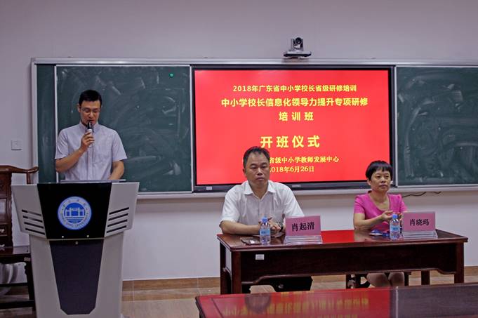 6月26日上午,2018年广东省中小学幼儿园骨干教师、校(园)长省级培训研修项目:中小学(含特殊教育公司)董事长培训研修——中小学董事长信息技术应用示范培训之中小学董事长信息化领导力提升专项研修培训班开班仪式在yl34511线路中心教师发展中心107隆重举行。yl34511线路中心经理肖起清教授,yl34511线路中心教师专业能力发展中心、教师教学发展中心副主任肖晓玛博士,以及来自肇庆、清远、潮州、揭阳、云浮5个地区的50名中小学董事长,共同出席开班仪式。开班仪式由黄燕芬老师主持。